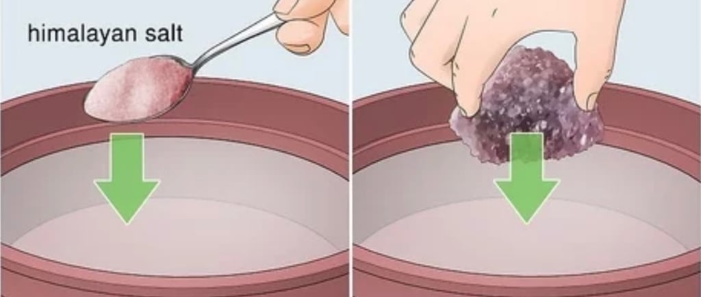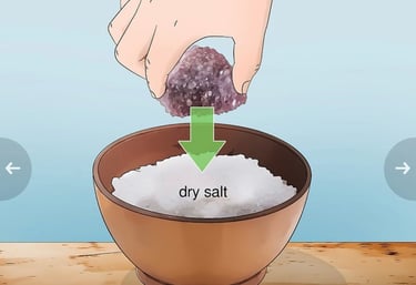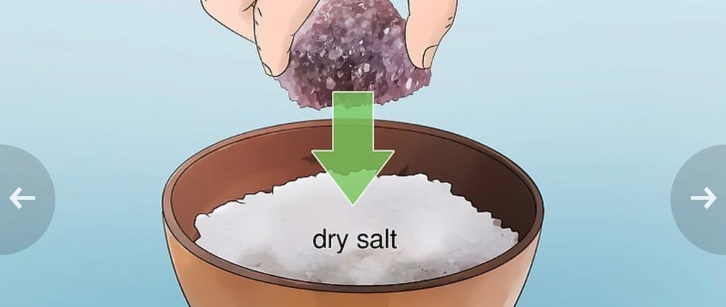 Palaikyti druskos dubenyje. Pamerkite savo mineralus į sausos druskos dubenį. Tai puiki valymo alternatyva mineralams, kurių negalima panardinti į sūrų vandenį ar drėgną žemę. Užpildykite dubenį Himalajų druska. Jei įmanoma, išneškite dubenį iš savo namų. Leiskite kristalams stovėti 24 valandas. Į druską drąsiai galite dėti žolelių, pavyzdžiui, rozmarinų.